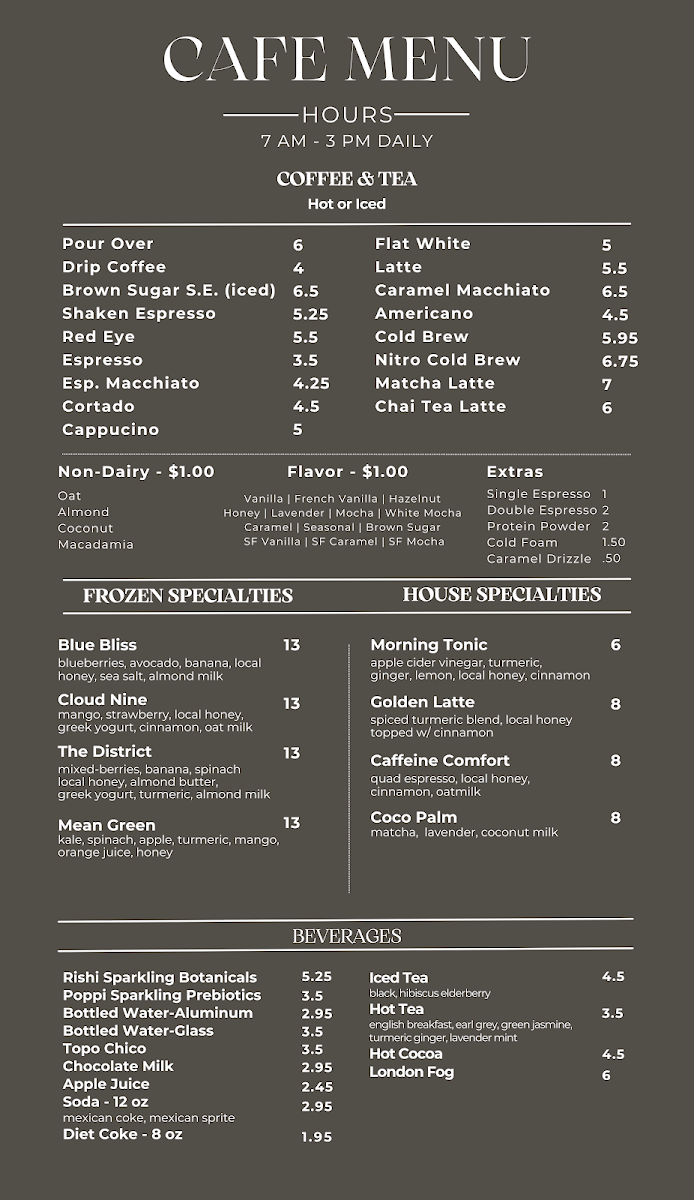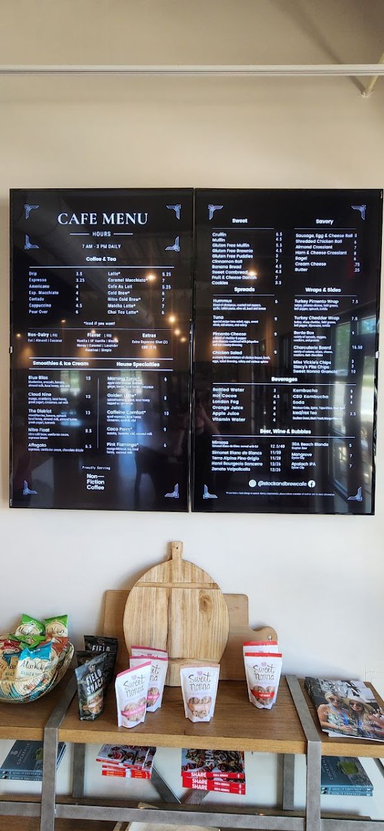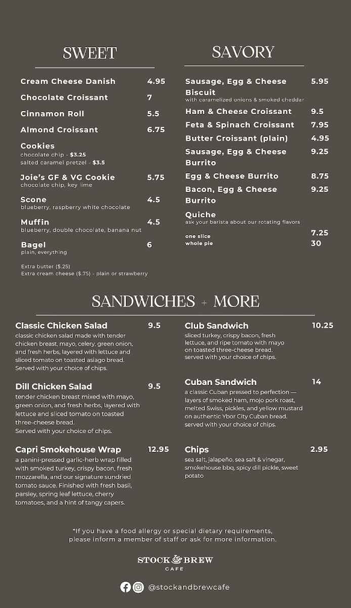 From a reviewer's perspective, the menu at Stock & Brew Cafe offers a thoughtfully curated blend of beverages, pastries, and meals that cater to a wide range of tastes. Coffee enthusiasts will appreciate options like the Iced Latte, Iced Shaken Espresso (16 Oz), and Cold Brew Drip Coffee, while house specialties such as the King Cake Latte, Brown Sugar Shaken Espresso, and Morning Tonic provide a creative twist. For smoothie lovers, the Cloud Nine, Blue Bliss, and Mean Green The District are vibrant, refreshing choices. Tea and other beverages, including Hot Tea - Jade Cloud, Lavender + Mint Tea, and Hot Chocolate - Kids 6 Oz, offer comforting alternatives, alongside grab-and-go drinks like Kombucha Pink Lady and Poppi - Ginger Lime. The pastry selection is equally enticing, featuring the Chocolate Croissant, Plain Butter Croissant, Salted Caramel Cookie, and the gluten-free, vegan Joie's Coconut Cashew Chocolate Chip Cookie. Breakfast items like the Egg & Cheddar Cheese Burrito, Quiche Lorraine, and Sausage, Cheddar & Egg Biscuit are available all day, ensuring a hearty start to any morning, while lunch offerings such as the Cuban Sandwich, Chicken Salad Sandwich - Dill, and Muffaletta & Gumbo Combo provide satisfying midday options. For those seeking light bites, the grab-and-go chips, including Miss Vickie's Jalapeno Chips and Uglies Sweet Potato Chips, and Happy Hour selections like the Hummus Plate, Marinated Olives, and Charcuterie Board round out a menu that balances indulgence with convenience. Overall, Stock & Brew Cafe presents a menu that is both approachable and inventive, making it an appealing stop for casual coffee runs, relaxed lunches, or a leisurely afternoon treat.